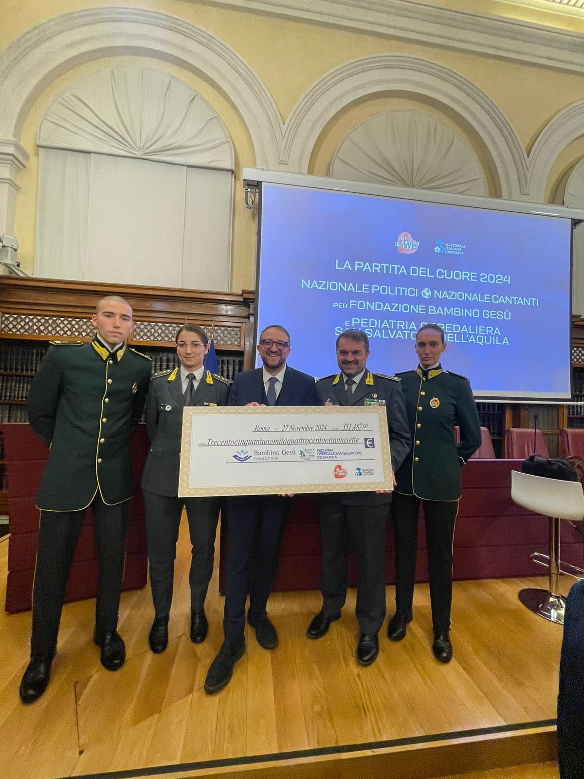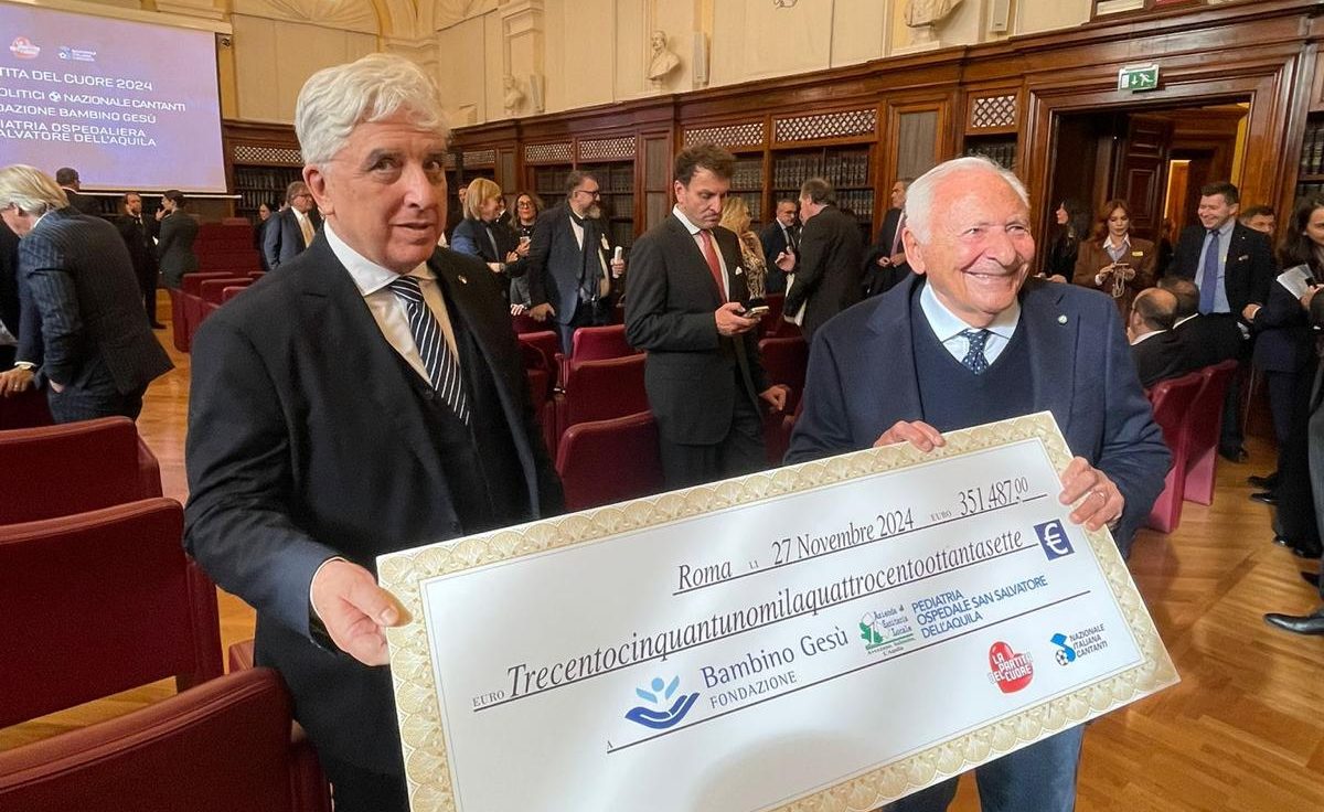 La cifra è stata raccolta durante l’ultima edizione della Partita del Cuore, giocata lo scorso 16 luglio allo Stadio Gran Sasso “Italo Acconcia” dell’Aquila che ha visto scendere in campo la Nazionale Cantanti e la Nazionale della Politica per raccogliere fondi a favore di due importanti realtà come Fondazione Ospedale Pediatrico Bambino Gesù di Roma e il reparto di Pediatria del Presidio Ospedaliero San Salvatore dell’Aquila. I proventi raccolti saranno destinati al sostegno dell’accoglienza delle famiglie dei pazienti al Bambino Gesù e all’acquisto di un ecografo per l’Ambulatorio Pediatrico dell’Aquila.