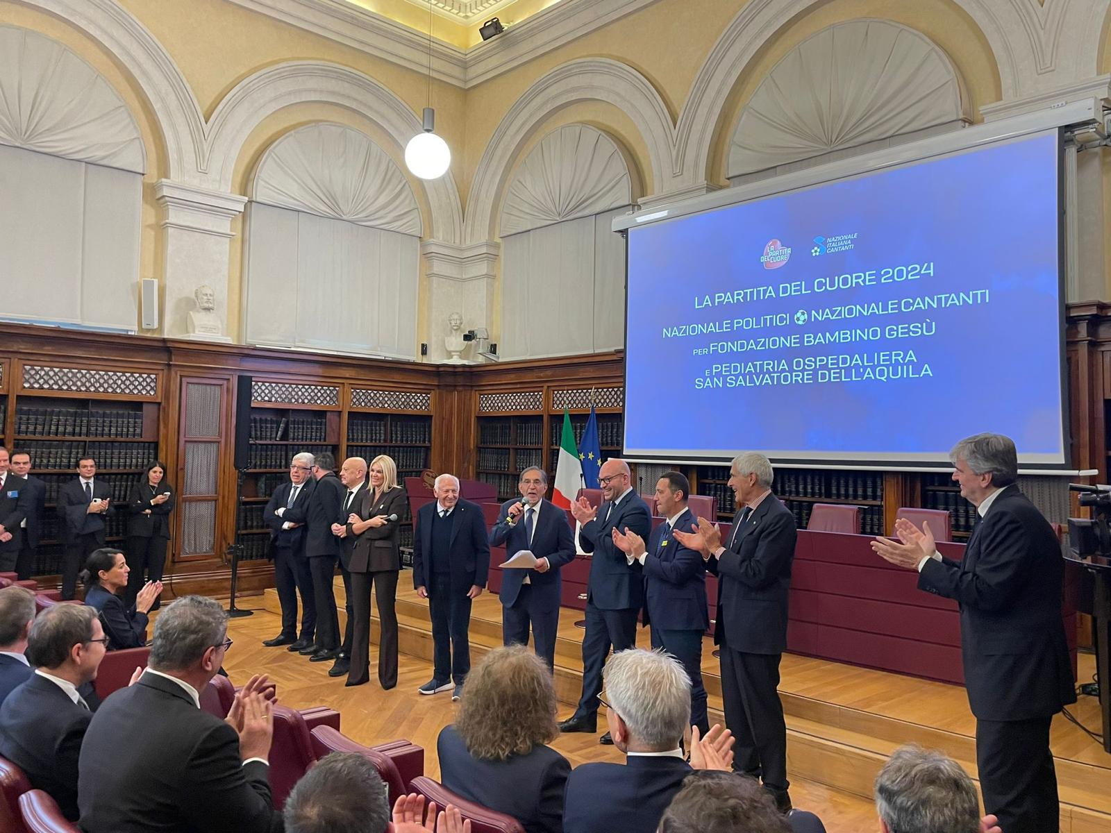Alla cerimonia hanno presenziato il Presidente del Senato Ignazio La Russa, il Presidente della Camera Lorenzo Fontana, i rappresentanti delle Istituzioni, il Dott. Gian Luca Pecchini – CEO della Nazionale Cantanti – e il Sottosegretario alla Cultura on. Gianmarco Mazzi, entrambi storici ideatori della Partita del Cuore.